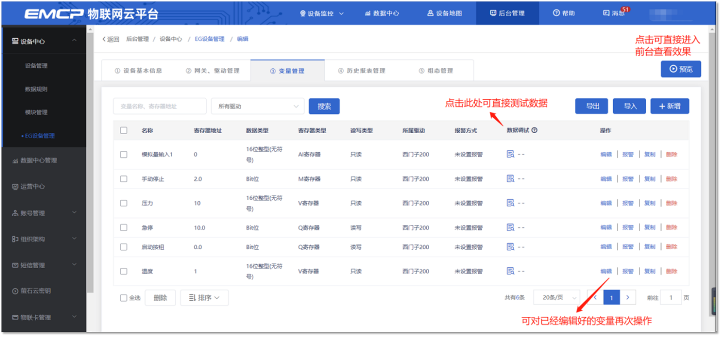 添加完成后,【变量管理】如下图所示,此时可以点击【数据测试】按钮,检查变量能否采集到数据,或者数据是否正确。