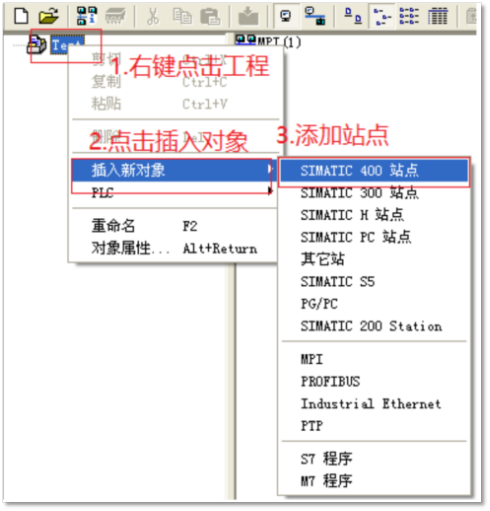 步骤一、打开STEP7编程软件,新建工程并添加SIMATIC 400 Station。