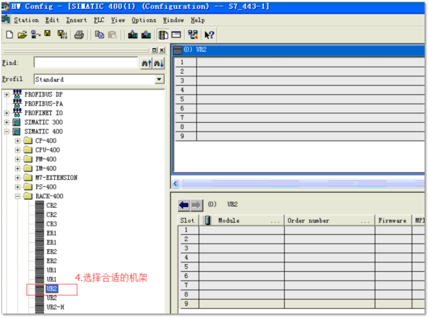 步骤二、添加机架:双击Hardware进入硬件配置界面,在Profil栏选择Standard,双击STMATIC 400,在RACK-400文件夹中选择与实际硬件完全匹配的设备,双击加入列表。如下图所示: