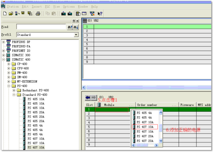 步骤三、添加电源模块:选中Slot1,在左边窗口SIMATIC 400->PS-400->Standard PS-400列表中,或单击右键选择“Insert Object”在弹出的选择框中选择与硬件匹配的设备。将其添加,如下图所示: