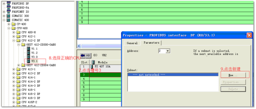 步骤四、添加CPU单元:选中Slot3,在左边窗口CPU-400列表中选择,或者使用右键找到与实际硬件对应的设备添加,此时会弹出一个配置PROFIBUS Interface DP的窗口,若使用MPI方式进通讯,此部分不需设置直接点击确认即可;若想使用DP口进行通讯,此部分需要进行设置,添加过程如下图所示: