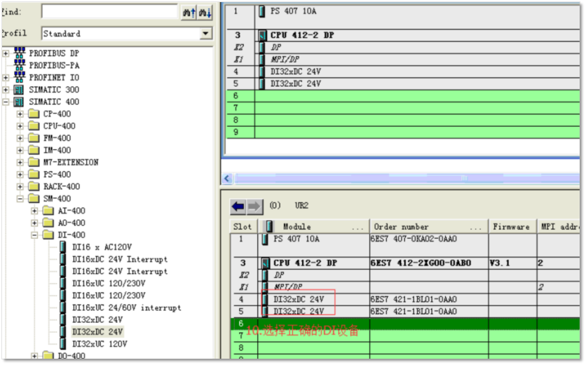 步骤五、添加2个DI模块:选中Slot4、Slot5,在左边窗口SM-400->DI-400列表中,或者使用右键找到与实际硬件对应的设备添加。如下图所示: