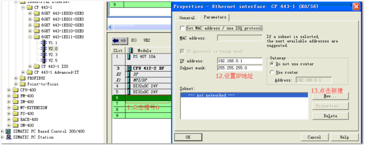 步骤六、添加CP443-1以太网通讯模块:选中Slot6,在左边窗口找到CP-400->Industrial Ethernet->CP443-1列表中,或者使用右键选择与实际硬件对应的设备添加。