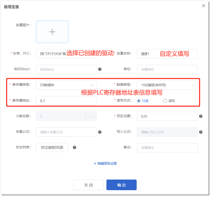 【变量名称】:自定义即可(如“温度1”),注意变量名称不允许重复。