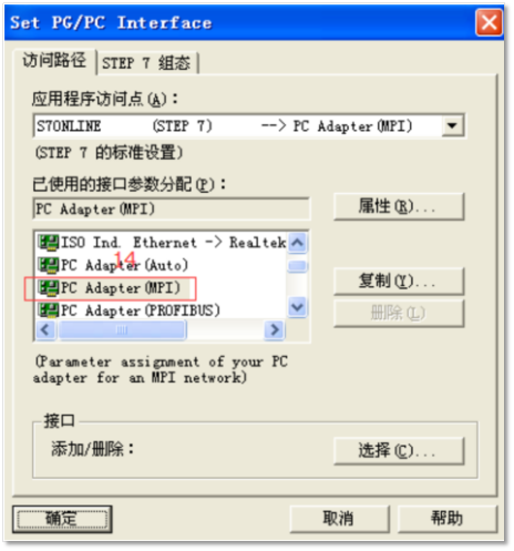 使用MPI方式将组态好的配置文件下载到PLC,打开Set PG/PC Interface,选择PC Adapter(MPI),并单击“属性”按钮进行相应配置。如下图所示: