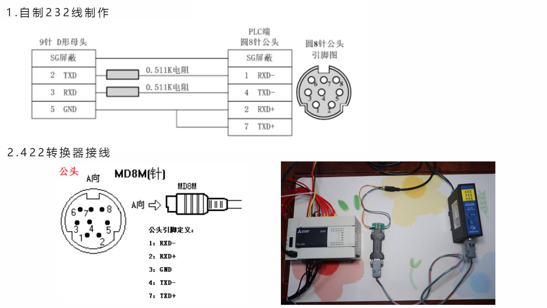 PLC连接电源(注意电源是24VDC还是220VAC),将编程电缆插上PLC的COM口,另一端连EG20的RS232或PLC的485串口连接到EG20的485A和485B接线端子。以国产FX3UPLC,R232接口为例,如下图:
