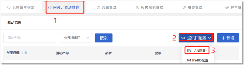 LAN口配置路径:【②:网关驱动管理】→【通讯口配置】→【LAN配置】。在弹出窗口中填写网关LAN口IP。