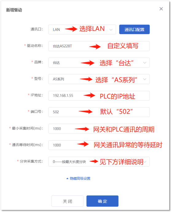 【仪表、PLC】:选择已创建的驱动名称(如上述创建的“台达AS228T”驱动)。