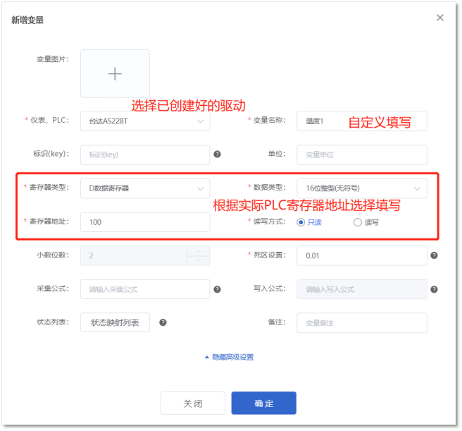 【变量名称】:自定义即可(如“温度1”),注意变量名称不允许重复。