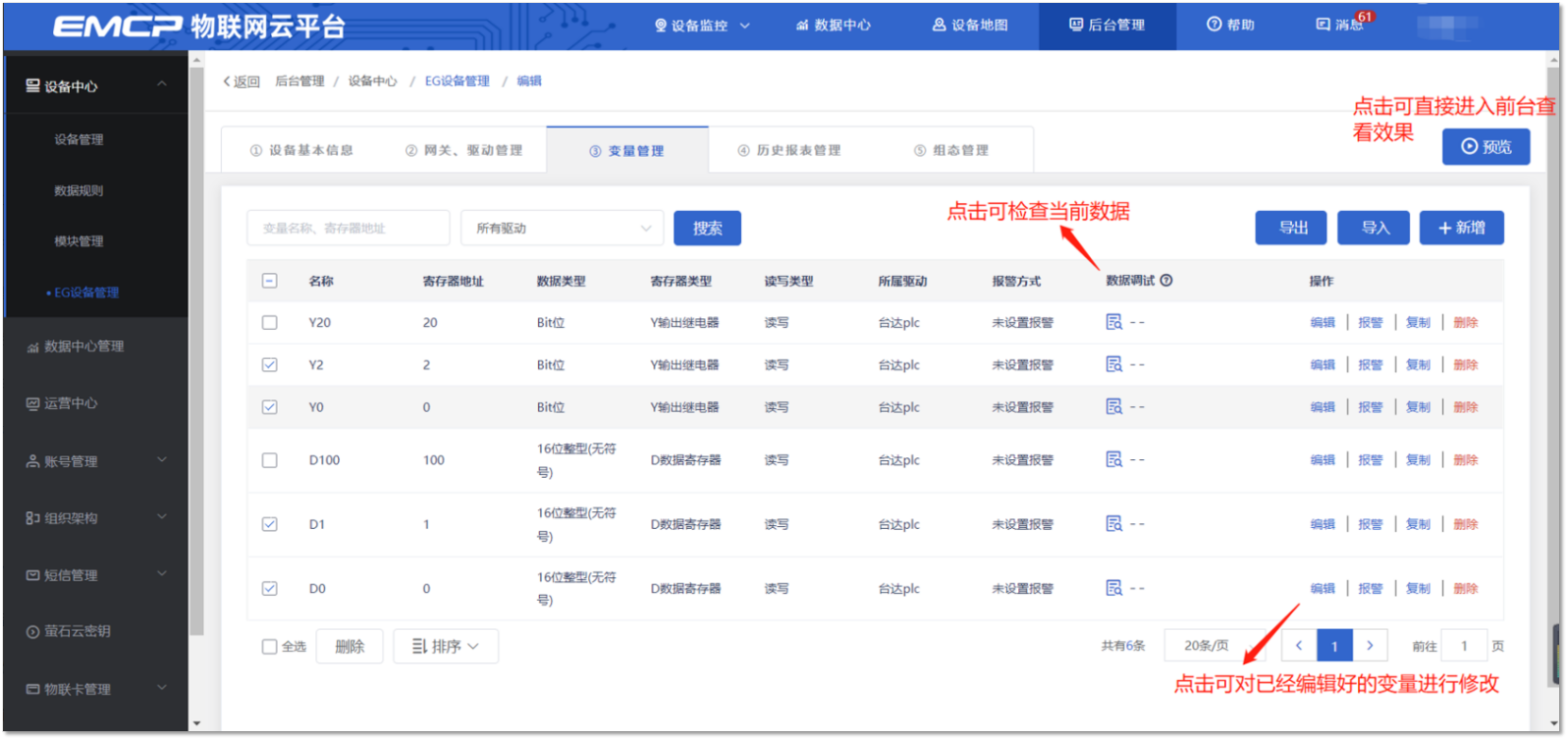 添加完成后,【变量管理】如下图所示,此时可以点击【数据测试】按钮,检查变量能否采集到数据,或者数据是否正确。