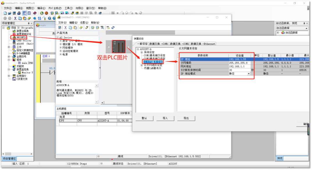 PLC自带的以太网口可以通过编程软件ISPSoft修改IP地址,如下图。