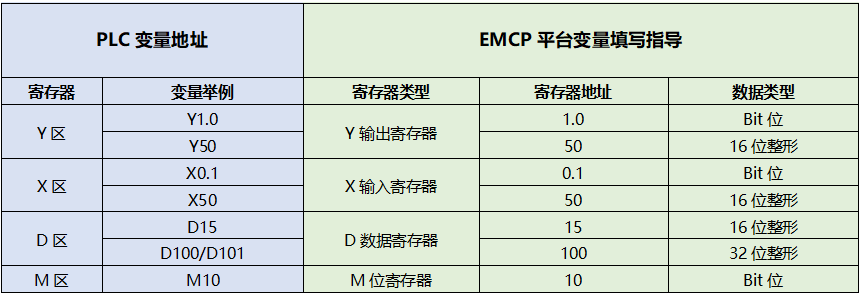 【寄存器地址】:地址填写时不带寄存区标志符,与实际寄存器地址一致。具体下图“平台地址填写举例”。
