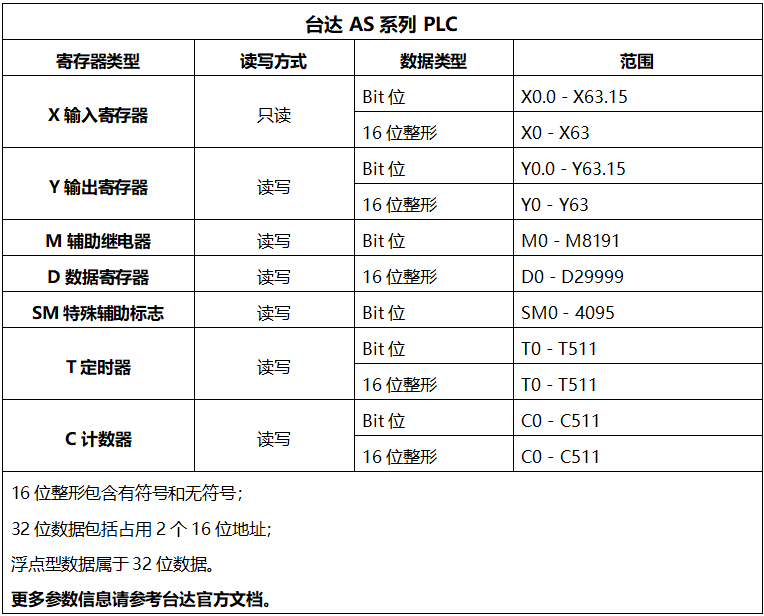 【寄存器类型】:填写对应台达PLC的寄存器类型(平台支持的寄存器类型:X/Y/M/D/SM/S/T/C等)。