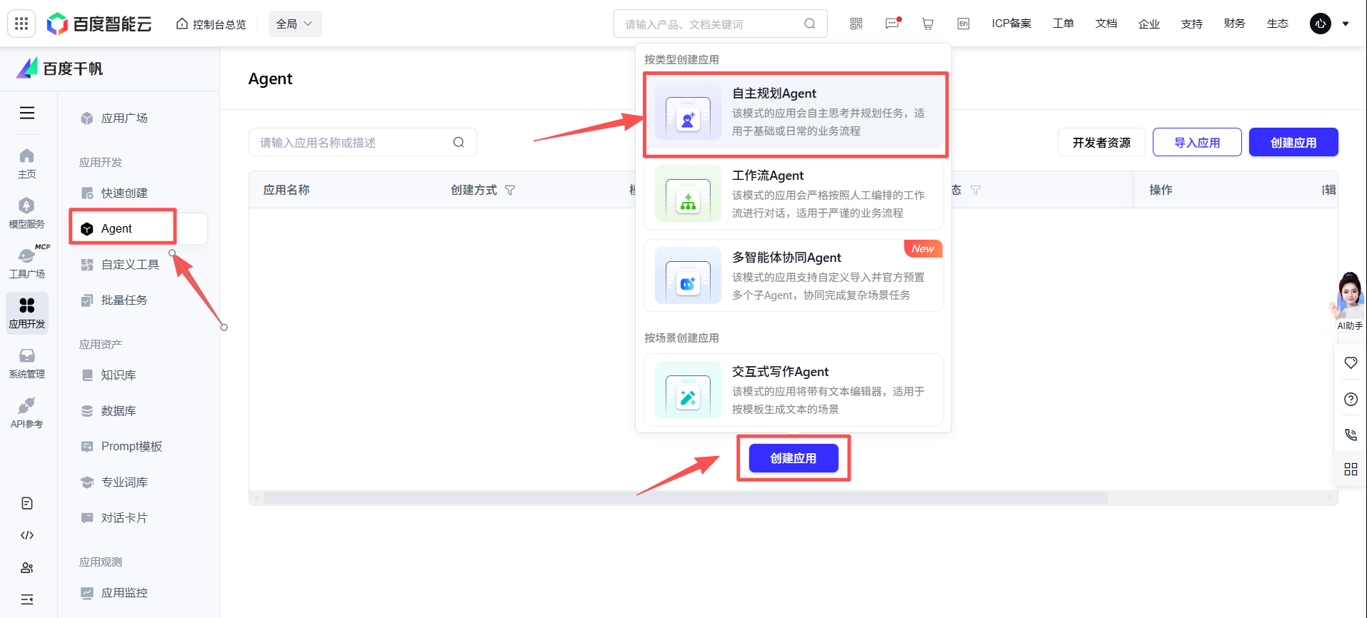 在打开的 智能云千帆AppBuilder中,点击左上角“创建”按钮,在下拉菜单中 ,选择“自主规划Agent”选项,可创建智能体应用