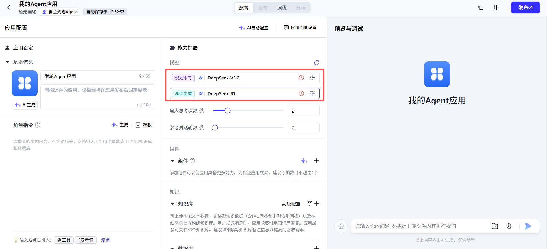 在页面中间 ,模型选择中,问答模型和规划模型,请选择 DeepSeek-V3模型,使用效果为最佳,价格也最优惠