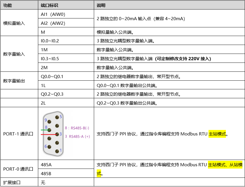 PORT-0接口支持modbus-RTU通讯,并引出到接线端子处,可做主站、从站。