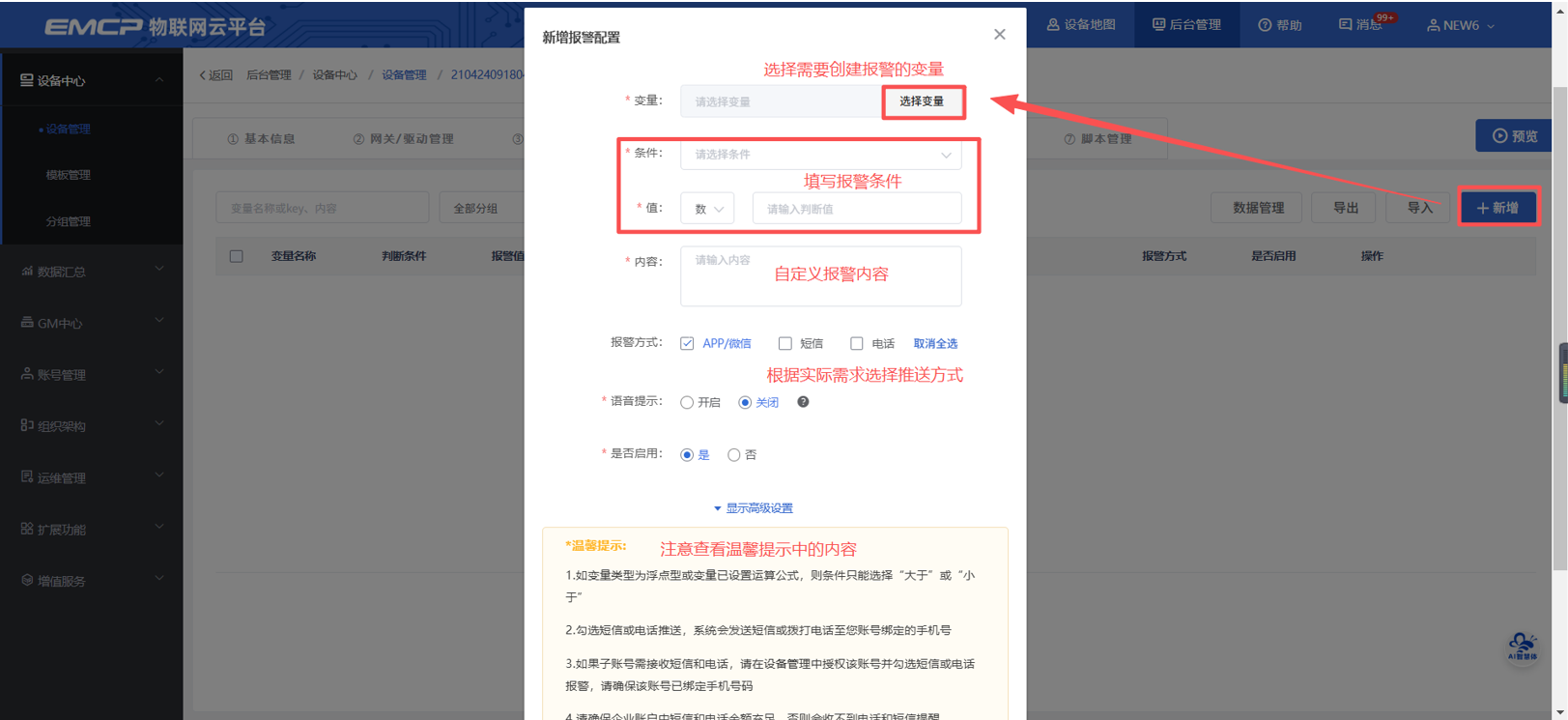 设置步骤:点击【④报警管理】→【新增】→填写报警信息与条件→【确定】。如下图所示: