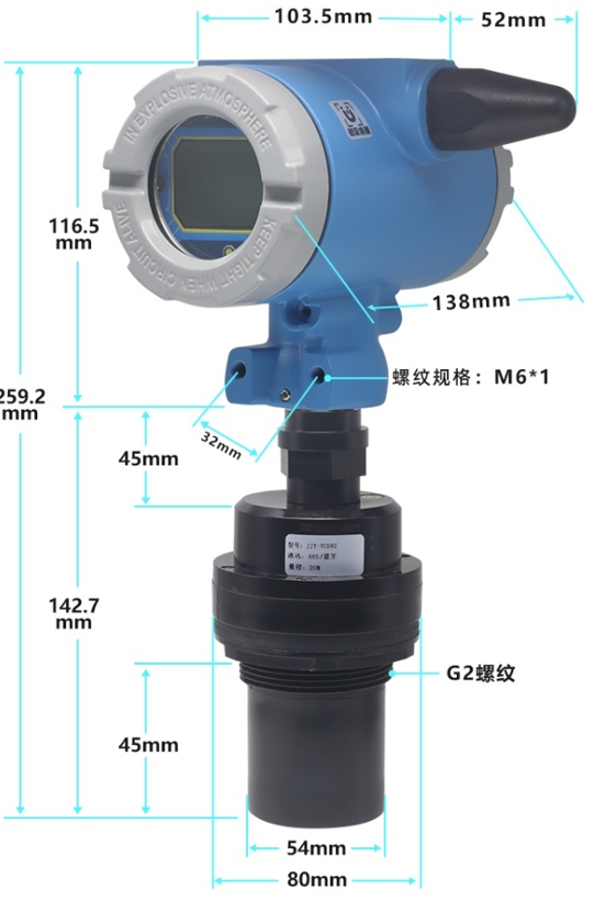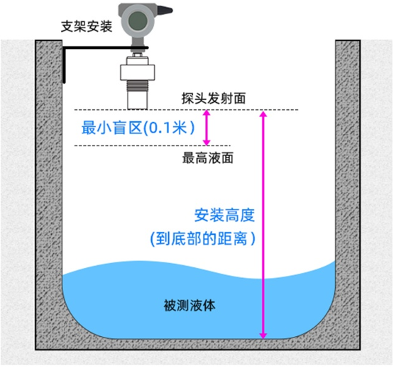 最小盲区:为仪表测量端面到液面最小的识别距离。如果超出则测量值只显示最大高度(即安装高度)。