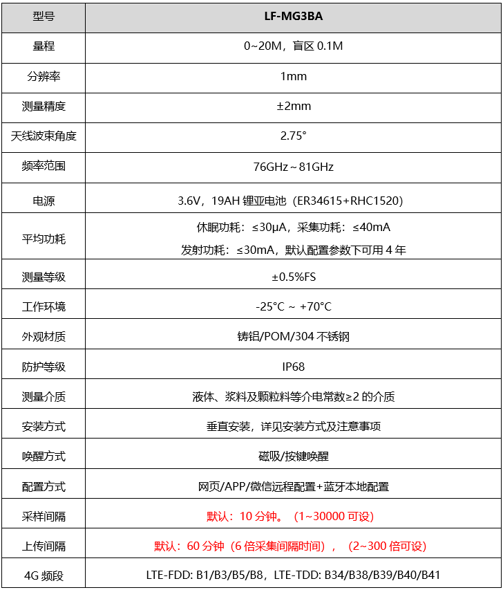 低功耗4G雷达液位计,是一款4G全网通仪表,采用超低漏电的锂亚硫酰氯电池供电,可应用于缺乏电源的工业场合。远传仪表采用防爆外壳一体化设计,EMC防护等多项保护设计,适合于恶劣的工业现场,支持本地蓝牙配置,可以使用手机直接连接设置参数,更加方便快捷。