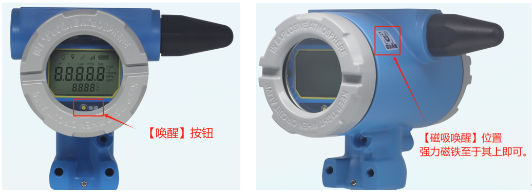 按钮唤醒:逆时针拧下远传仪表前盖,在面板中下方点击【唤醒】按钮即可。
