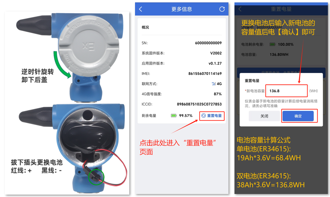 更换电池后,务必要通过“云联物通”APP-进入蓝牙配置(按上8.2说明),在“参数配置”页面点击【更多信息】进入上图“更多信息”页面,在点击【充值电量】文字按钮进入“重置电量”页面,按图中容量计算公式填入对应的“新电池容量”,点击【确认】即可完成新电池的更换工作。