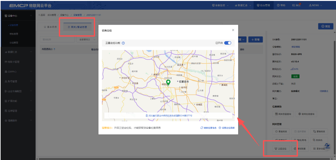 卫星定位功能开启入口如下:后台管理>>设备中心>>设备管理>>网关/驱动管理,在右侧的“网关管理”功能中,点击“卫星定位按钮”,可打开设置弹窗