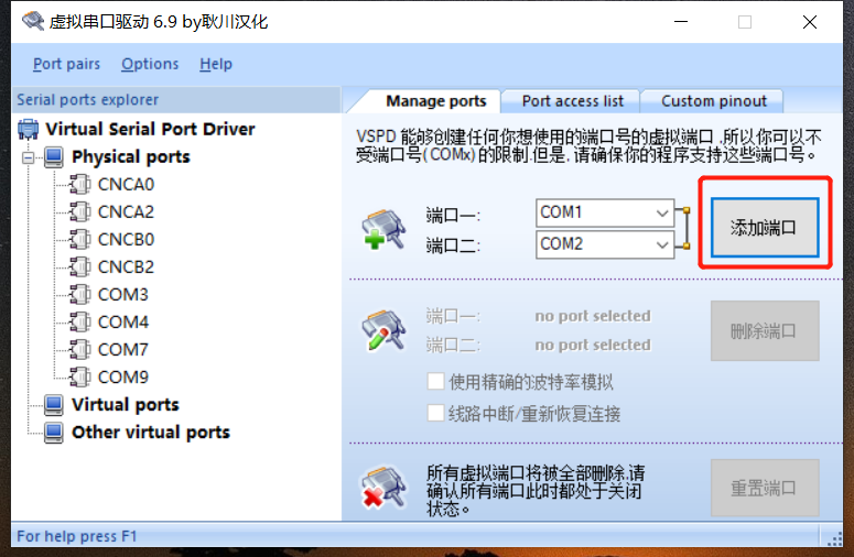 第五步:使用串口时,需要点击“添加”,生成2个虚拟串口,如图所示,本案例中为COM1和COM2(不同电脑串口号不同,只要能生成一对虚拟串口即可):