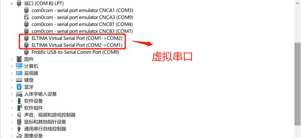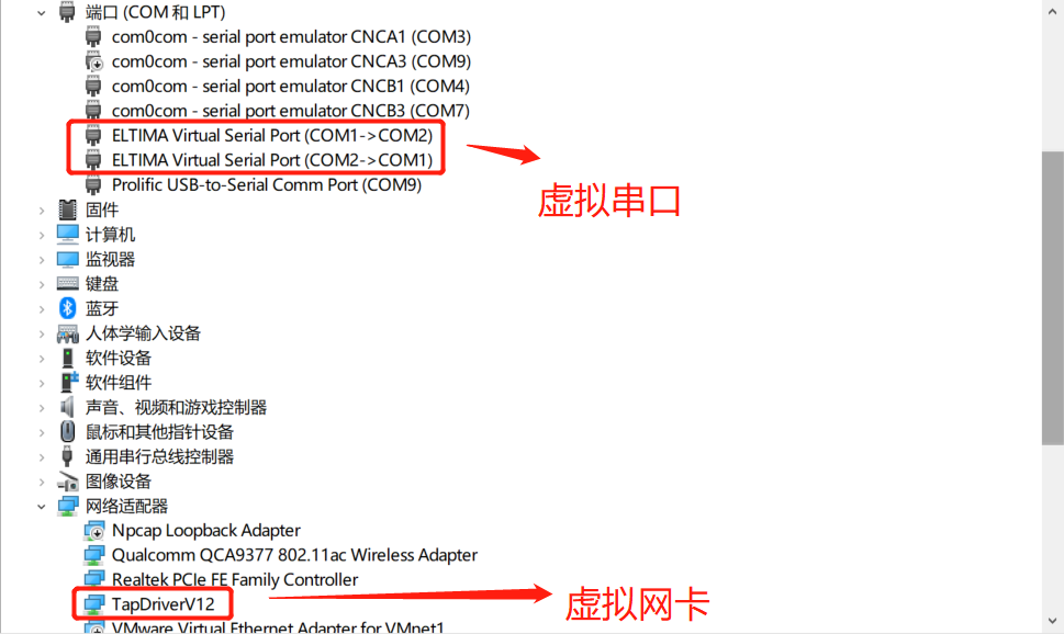 打开设备管理器,可以在设备管理器中找到对应的虚拟网口和虚拟串口: