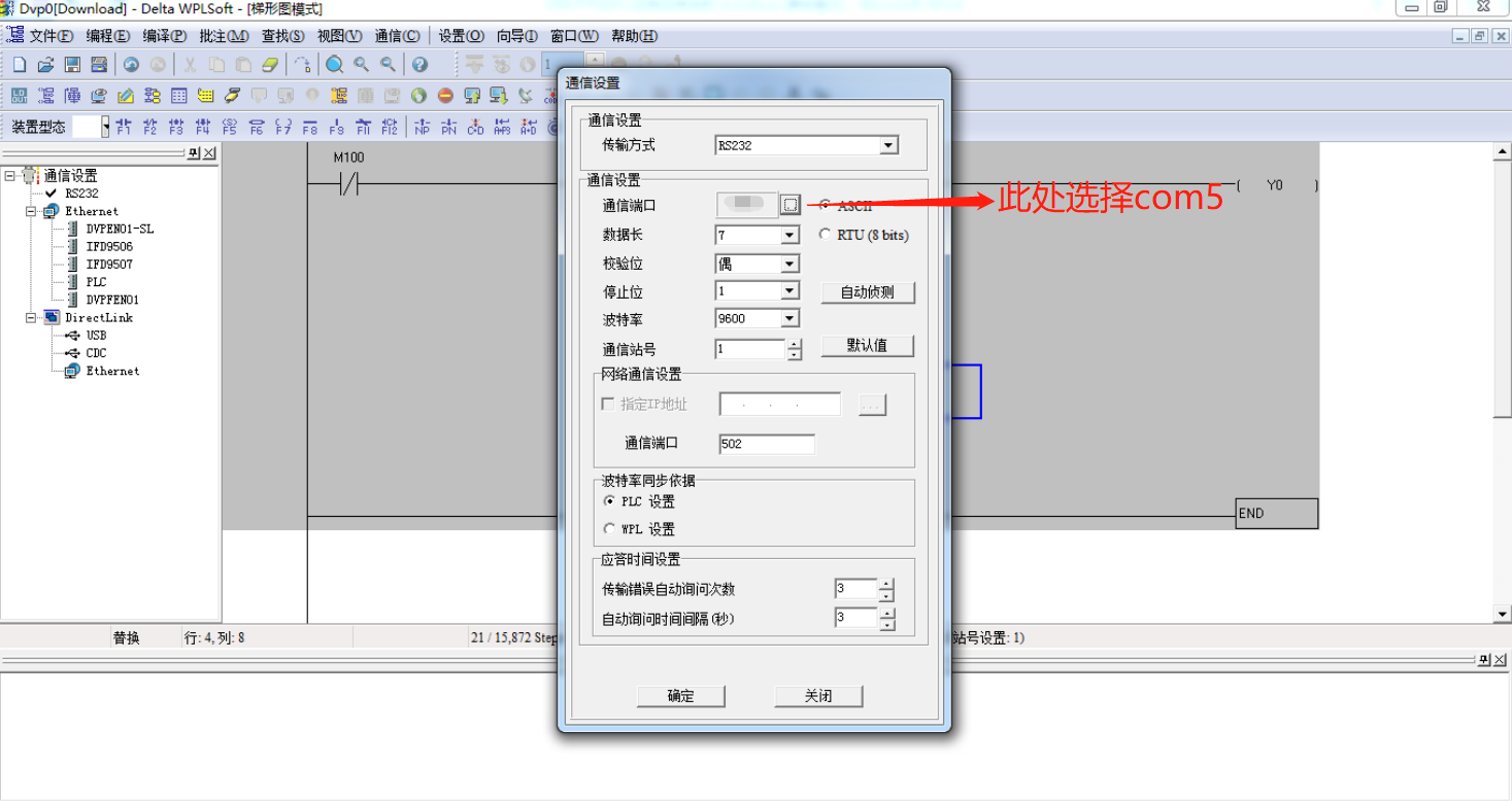 【传输方式】选择【RS232】(因为下拉列表中没有 RS485 选项,此款 PLC使用 RS485只能选择 RS232 传输方式);【通讯设置】中,【通讯端口】处应选择串口工具生成的另一个虚拟串口,本示例选择的是虚拟串口【COM5】,其他参数直接点击默认值即可。设置完成之后,点击【确定】即可。如下图: