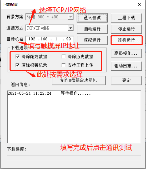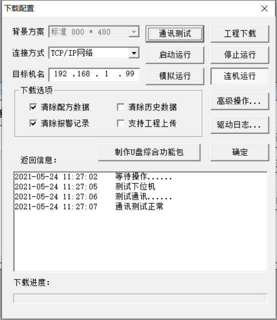 第三步:点击通讯测试,当通讯测试正常后,即可点击工程下载将程序下载到触摸屏中: