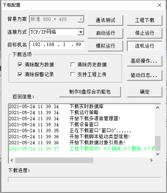 注:点击工程下载后,下载时间比用网线直连或USB下载要长,属于正常现象。 此过程千万不要断电或者断网,否则需要重新下载触摸屏程序。