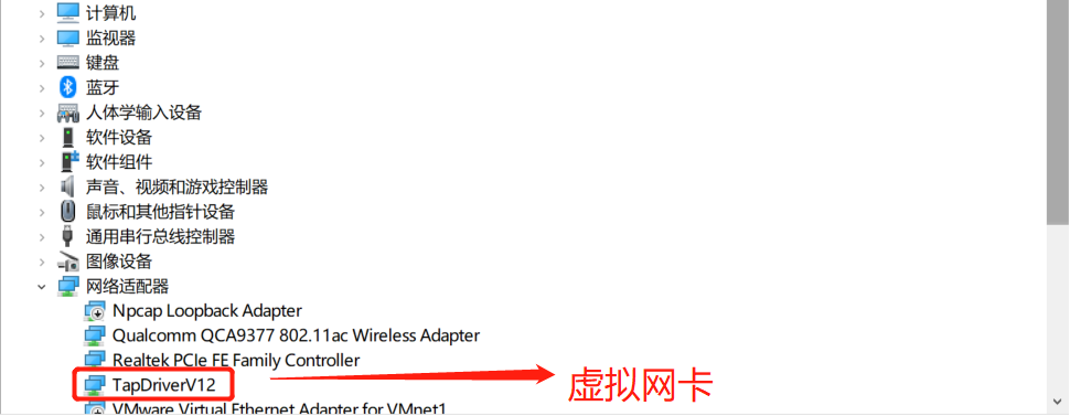 打开设备管理器,在设备管理器中出现TapDriverV12,即已安装好虚拟网卡,可进行下载操作: