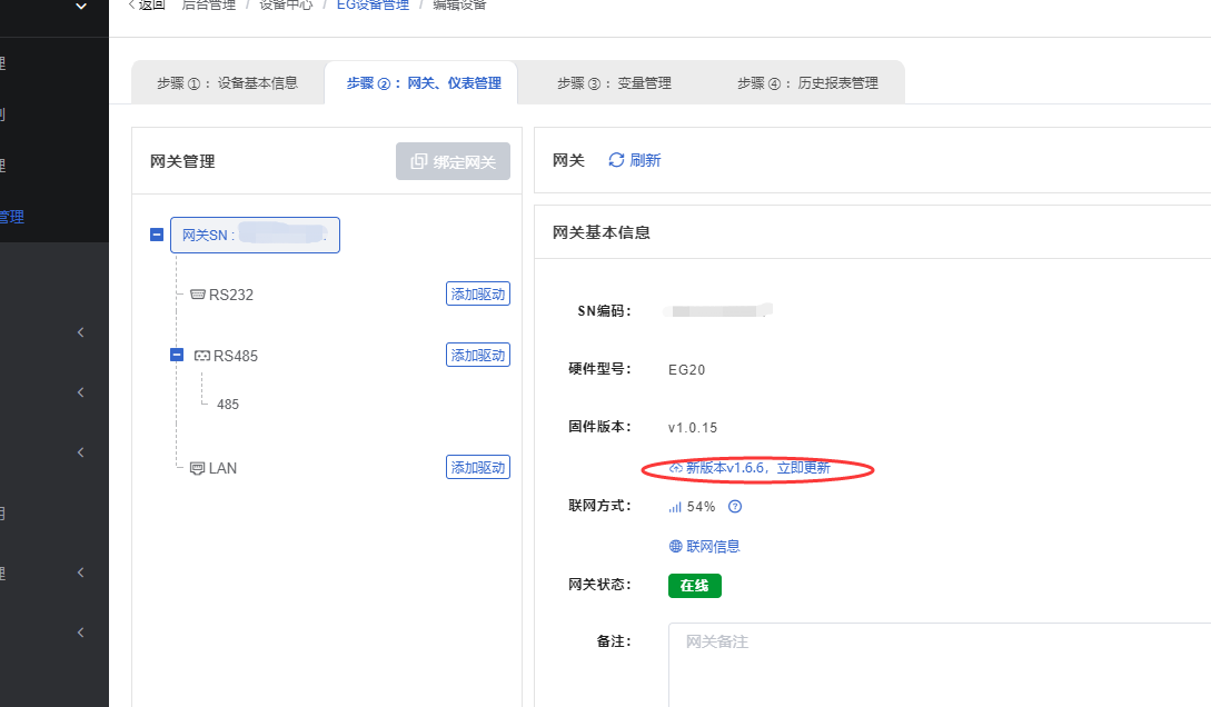 1、在使用此工具前,需保证EG20网关已绑定到EMCP云平台,同时固件版本为v1.6.6以上。如果不是,点击固件版本处的更新,如下图所示。
