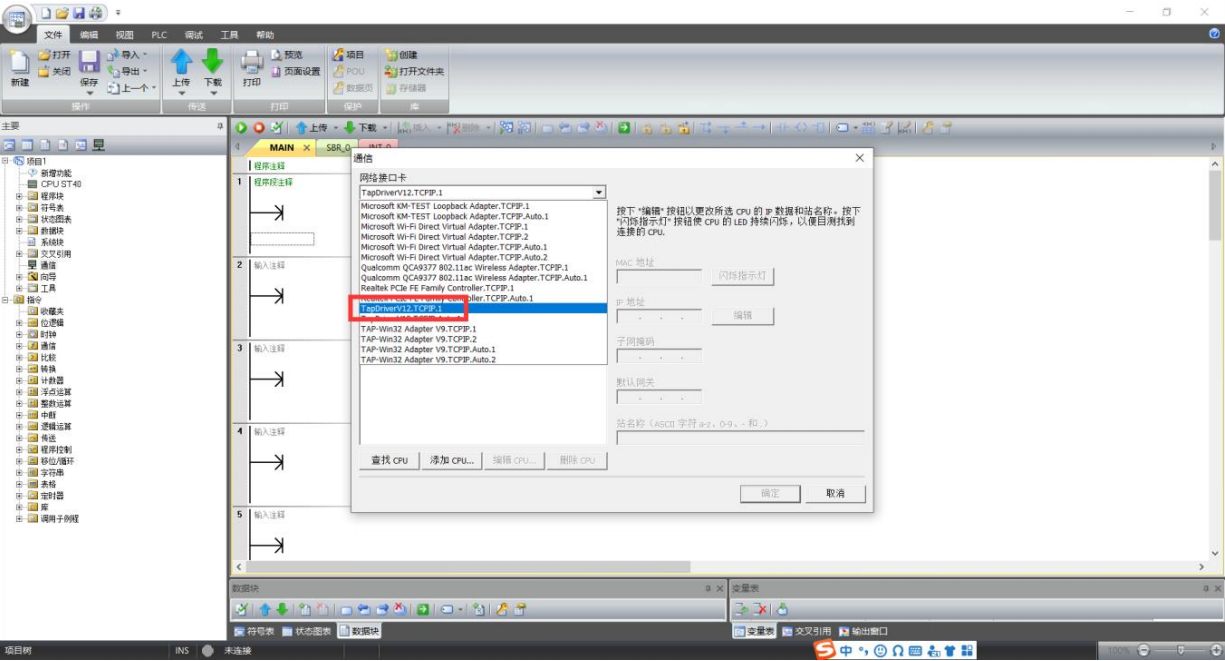 第一步:打开程序文件,进入软件【通讯】功能页,选择网卡为【TapDriveV12.TCPIP.1】, 如下图: