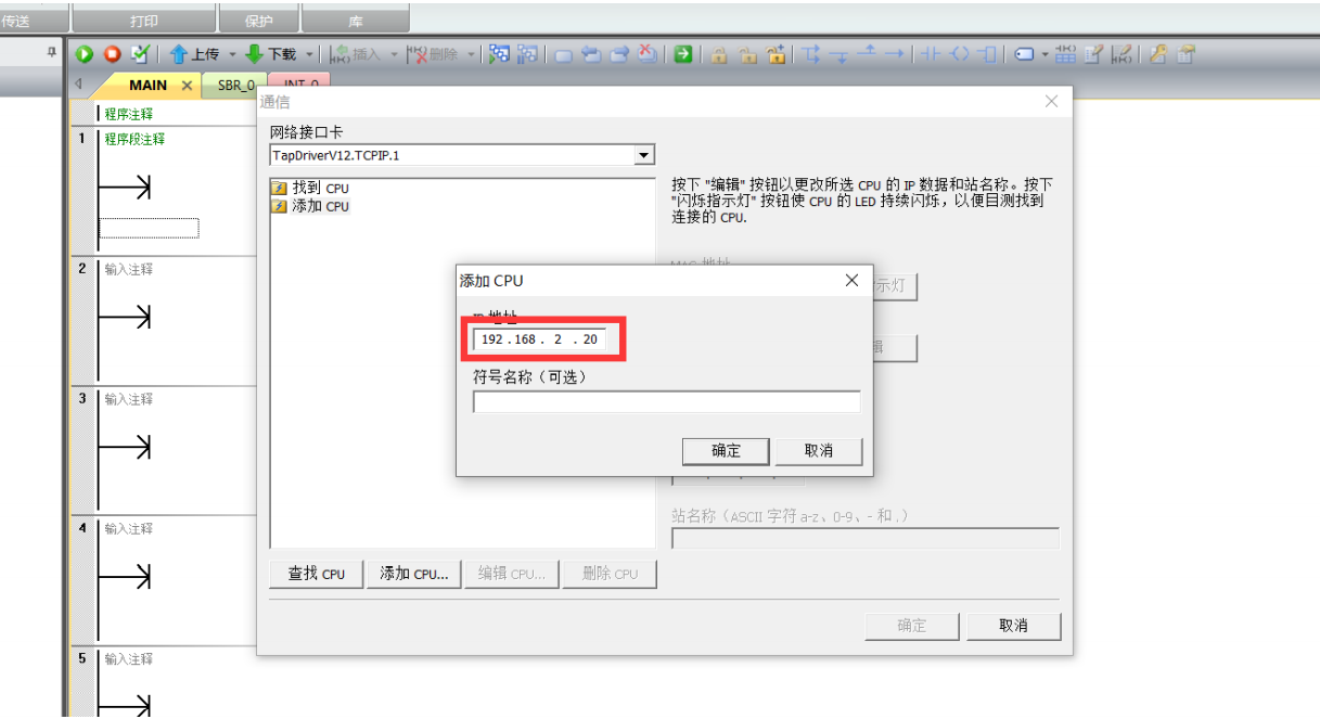 第二步:手动添加 PLC 的 IP。此处无法使用查找 CPU 功能。如下图: