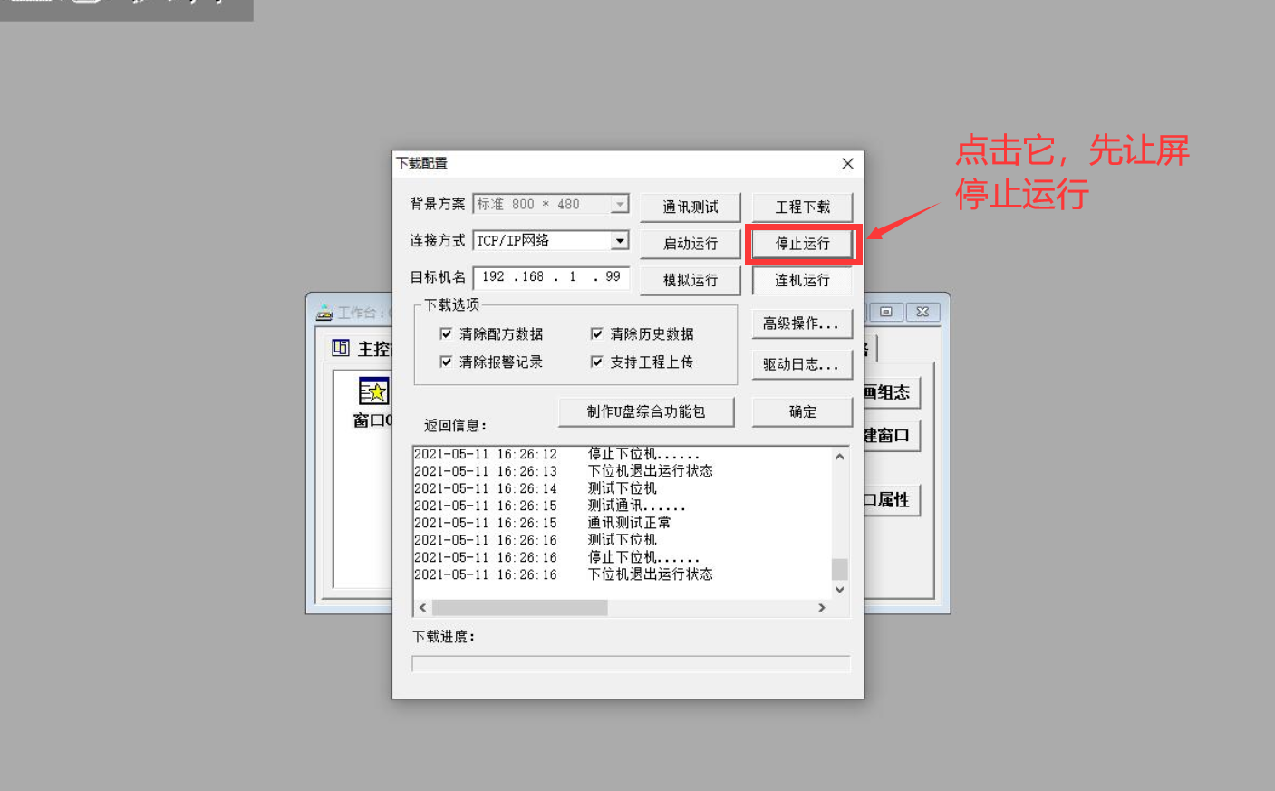 第一步:先将远程工具连接MCGS触摸屏,然后将屏远程停止运行。