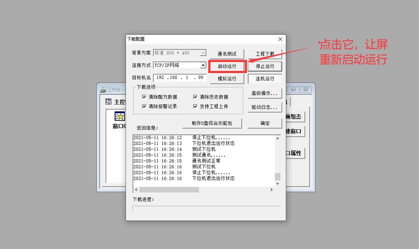 第三步,PLC远程下载结束后,重新连接MCGS屏,然后将屏远程启动运行。