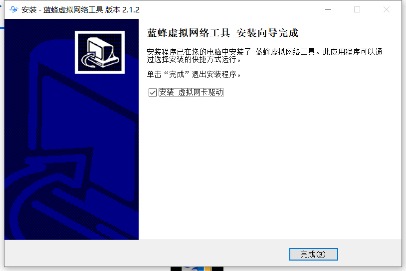 当安装完虚拟网络工具本体后,会弹出页面提示安装虚拟网卡驱动,如果是第一次安装,请勾选【安装虚拟网卡驱动】,点击【完成】可以等待桌面出现远程下载工具的图标,完成安装。