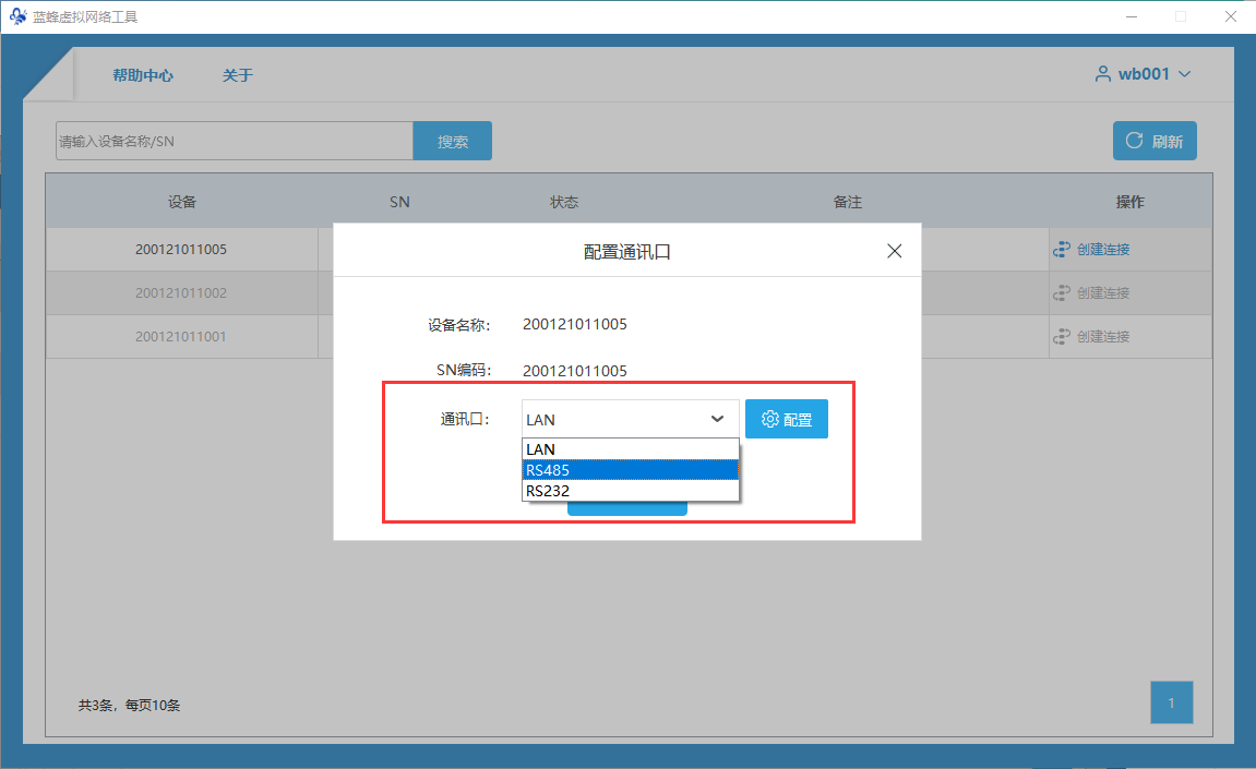 第三步:在弹出窗口中选择【RS485】,这里是选择网关的通讯口,并点击【配置】按钮: