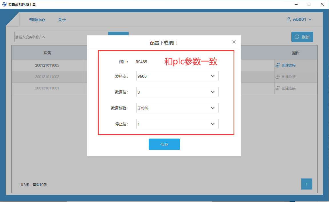 第四步:在配置界面中,需要将串口参数设置和实际PLC参数设置一致,完成后点击【保存】。之后点击【下一步】