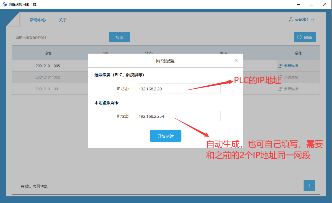 第五步:填写要连接的PLC的IP地址和本地虚拟网卡的IP地址,配置好后,点击开始创建: