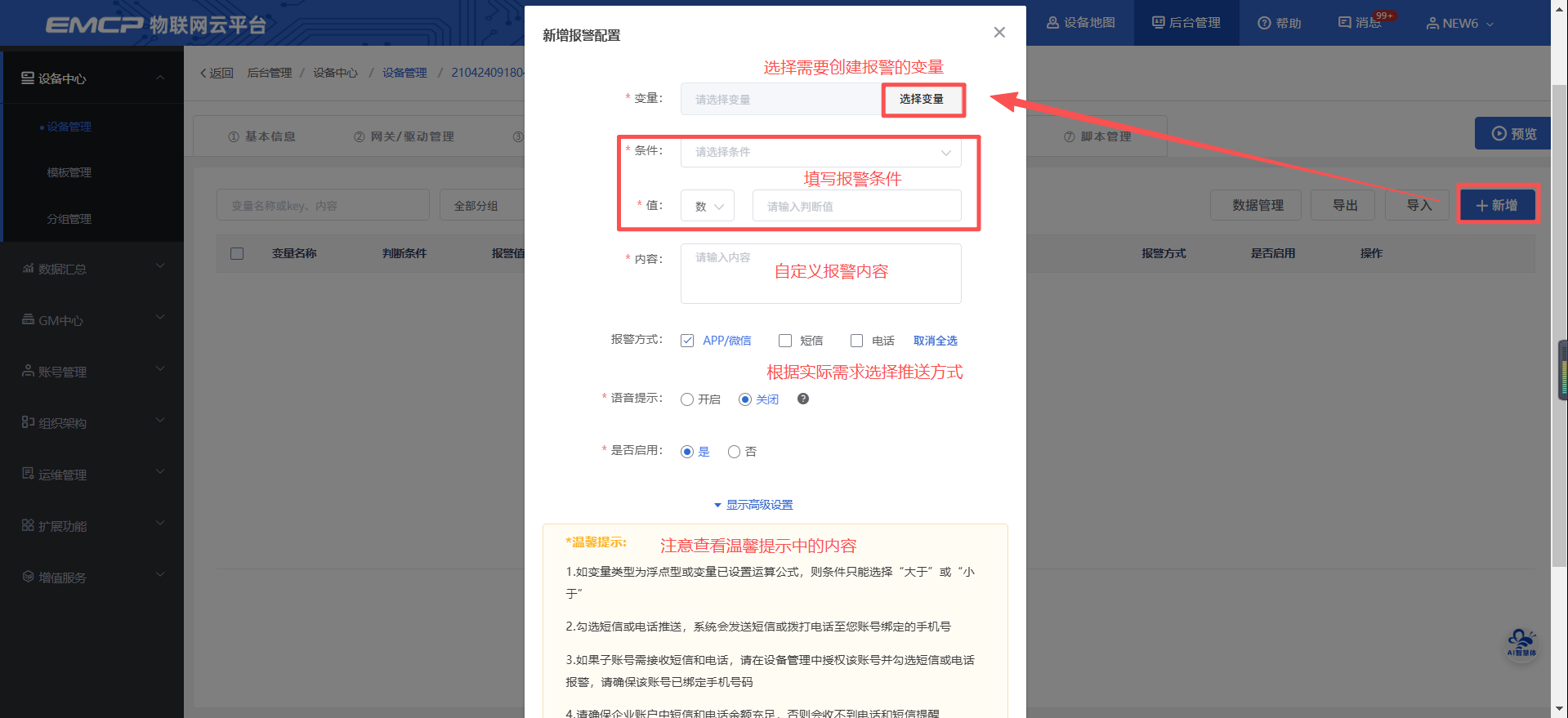 设置步骤:点击【④报警管理】→【新增】→填写报警信息与条件→【确定】。如下图所示: