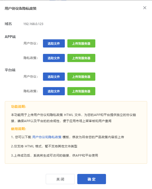本功能用于为APP端和平台端(PC端)分别上传独立的用户协议和隐私政策HTML文件,生成可访问的专属链接。满足应用市场上架审核要求,确保用户在使用APP或访问平台时能够便捷查阅相关法律文本,保障产品合规性。