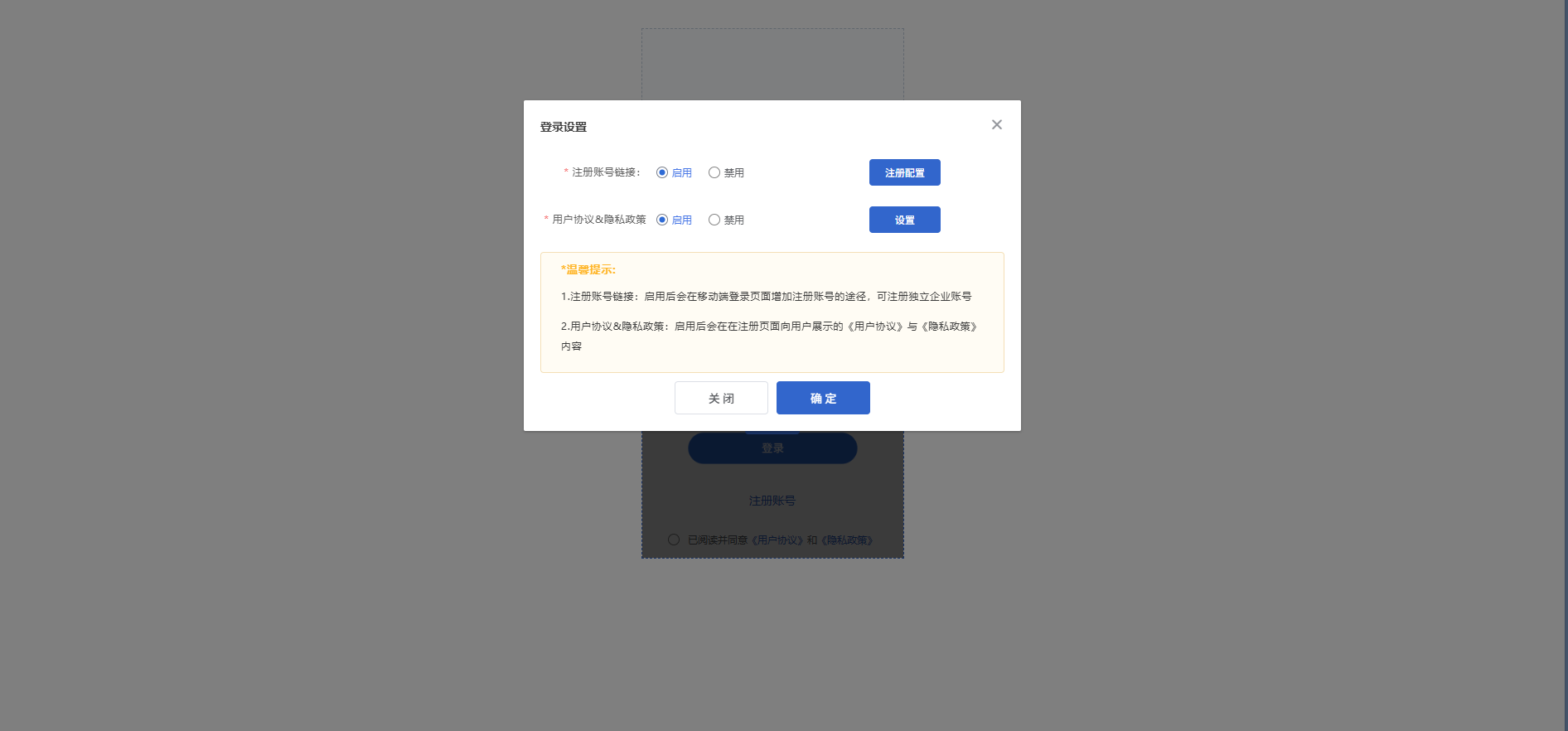 可设置当前企业风格在移动端是否在支持注册,以及是否支持 用户协议和隐私政策