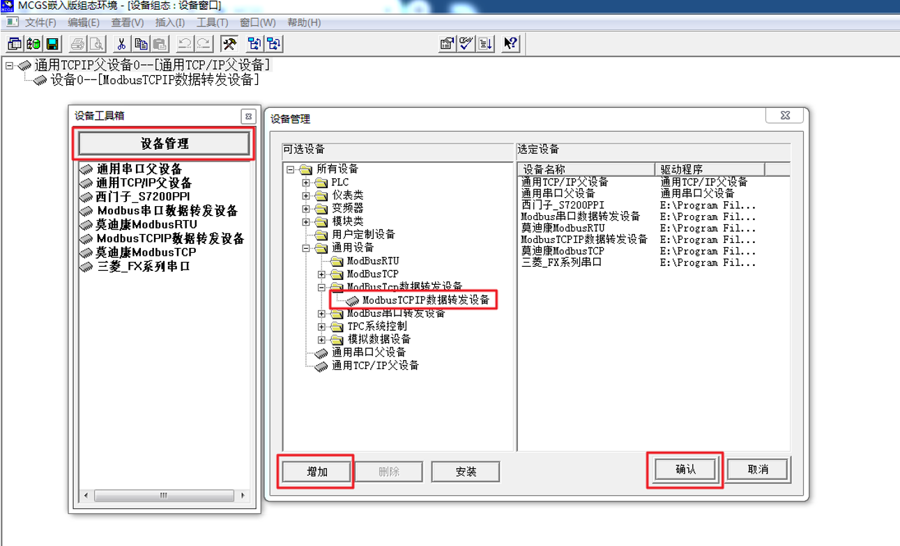 第一步,新建一个MCGS工程,在设备窗口中添加“通用TCP/IP父设备”和“ModbusTCPIP数据转发设备”。如果没有“ModbusTCPIP数据转发设备”可以在页面右键单击选择“设备工具箱”,在“设备管理”中选择对应的设备,点击“添加”,实例如下: