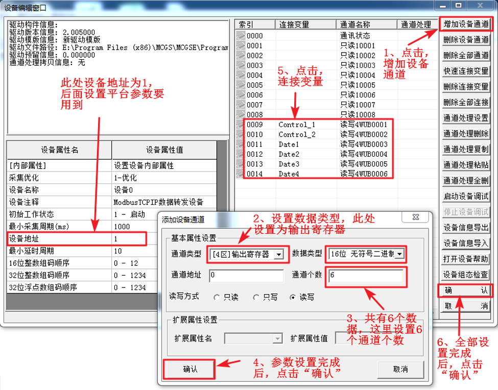 第三步,设置“ModbusTCPIP数据转发设备”,双击“ModbusTCPIP数据转发设备”打开设备编辑窗口,在此窗口中,需要设置ModbusTCPIP数据转发设备的设备属性值和添加数据变量,我们添加Date1-Date4共4个4区的16位整形变量,作为EMCP平台定时采集触摸屏的数据,Control_1和Control_2变量为EMCP平台对触摸屏进行读写操作的数据。