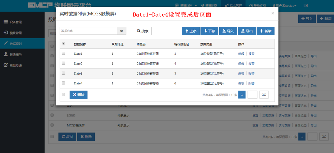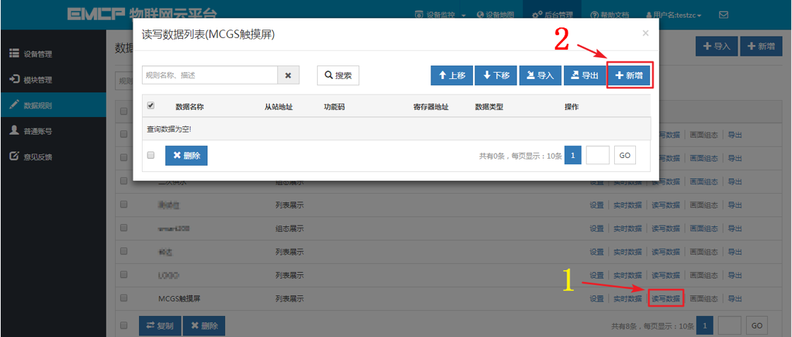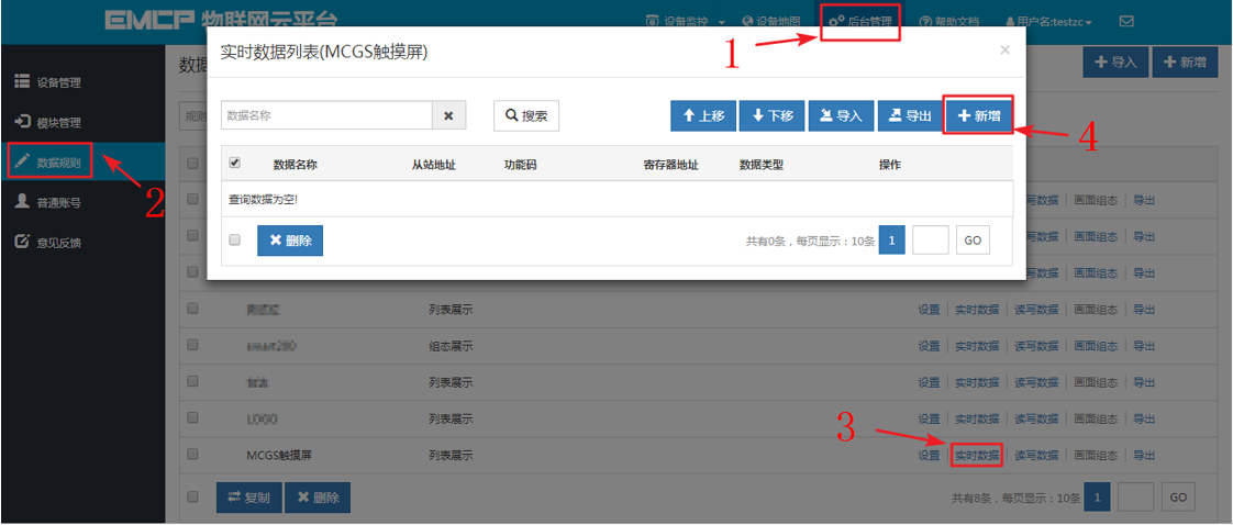点击网页左侧的【数据规则】进入规则设置页面,点击右上角的【新增】,在弹出的窗口中设置该数据规则的名称【MCGS触摸屏】和展示样式【列表展示】,我们可以选择列表展示或组态展示,列表展示:我们所添加的数据会以固定的列表样式展示,列表展示方式简单方便(数据测试阶段可选用列表展示)。组态展示:我们可以任意绘制设备数据的展示样式比如添加图形、图片、仪表盘、柱状填充和文字等内容(此功能类似传统的组态软件可参考《EMCP平台画面组态使用说明》文档)。数据规则新建完后点击【实时数据】新增实时数据(3.1.2中设置的Modbus配置),点击【读写数据】创建平台对设备手动读写操作的数据。创建规则展示如下。