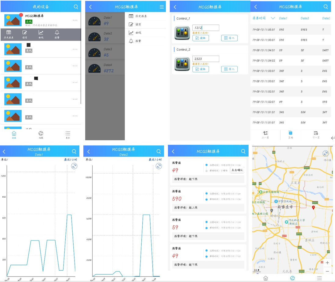在手机安装《云联物通》手机APP(可通过电脑网页平台登录页右上角的二维码扫描下载,或各大应用商店下载),凭用户名和密码登录,进入设备列表后点击【MCGS触摸屏】设备,直接进入的是实时数据列表页面或组态画面(组态展示方式下),点击右上角菜单栏【三杠按钮】,弹出功能菜单,在菜单中点击【读写数据】对读写数据进行读写操作,点击【历史报表】查看设备的历史存储数据报表,点击【历史曲线】可查看各数据的历史趋势图,点击