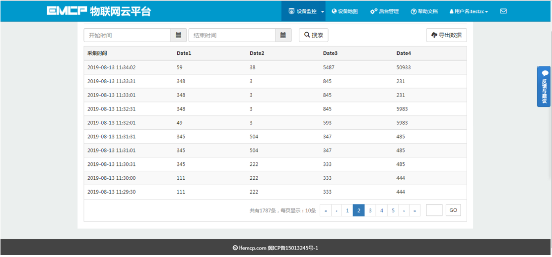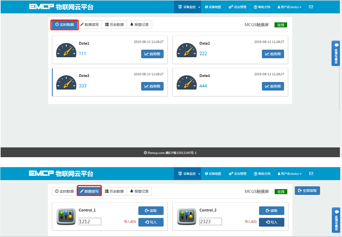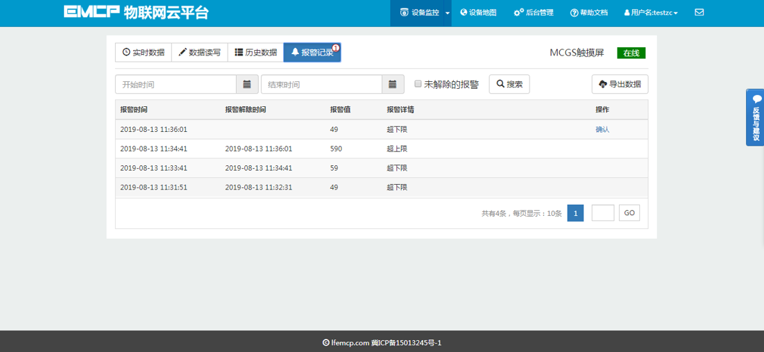用户登录EMCP平台(www.lfemcp.com),点击【MCGS触摸屏】设备的图片或设备名称进入设备。首先看到的是MCGS触摸屏定时采集数据的显示(实时数据),通过点击【读写数据】对MCGS触摸屏内部的数据进行读写。点击【历史数据】查看设备定时存储数据的历史数据报表,点击【报警记录】进入报警信息记录报表页面,显示如下。