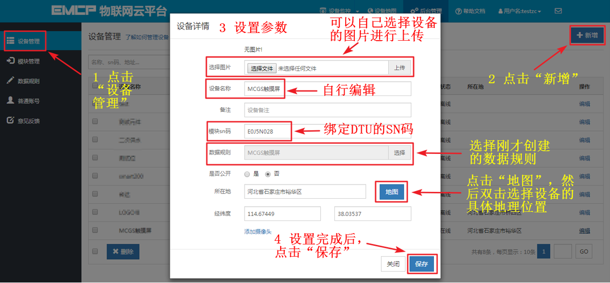 4,点击【地图】按钮选择设备所在的地理位置。完成后点击【保存】。